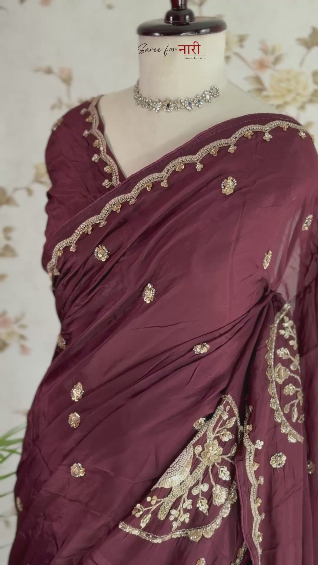 - The stunning vine-colored viscose silk saree adorned with intricate bird motifs all over, featuring a delicate mix of sequins, pearls, and beads that add a distinctive charm — paired with a beautifully heavy blouse.