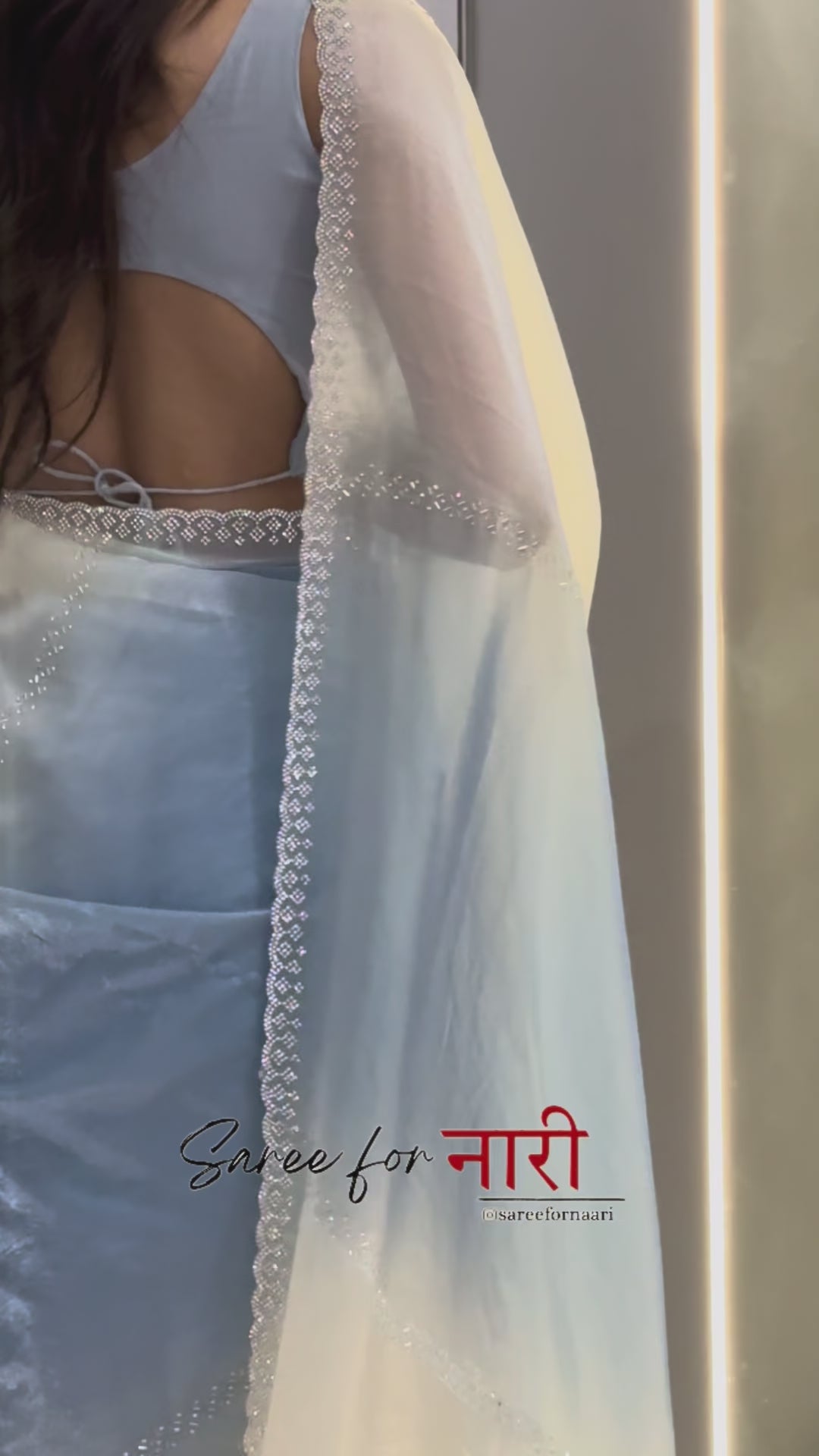 A dreamy blend of white and sky blue in soft organza, this saree features elegant vertical lines of silver stone work that add subtle sparkle and length to the drape. Finished with a heavy embellished border for a refined touch. Light, flowy, and perfect for daytime celebrations or evening elegance.