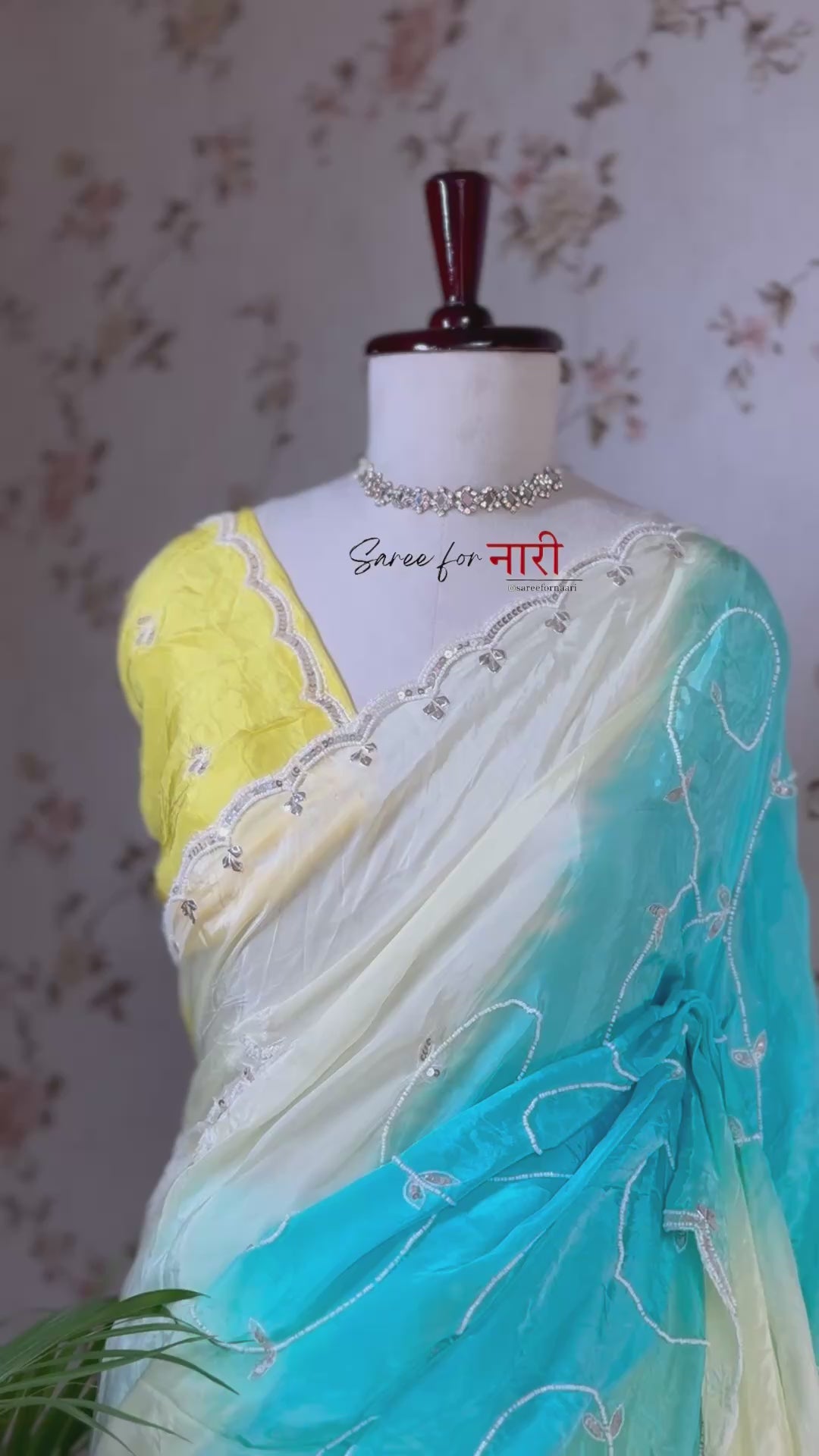 - A beautiful tissue blend silk saree in serene ombre shades of yellow and blue, adorned with delicate pearl and sequin work all over. The subtle bootas and perfectly balanced blouse complete this graceful look.
