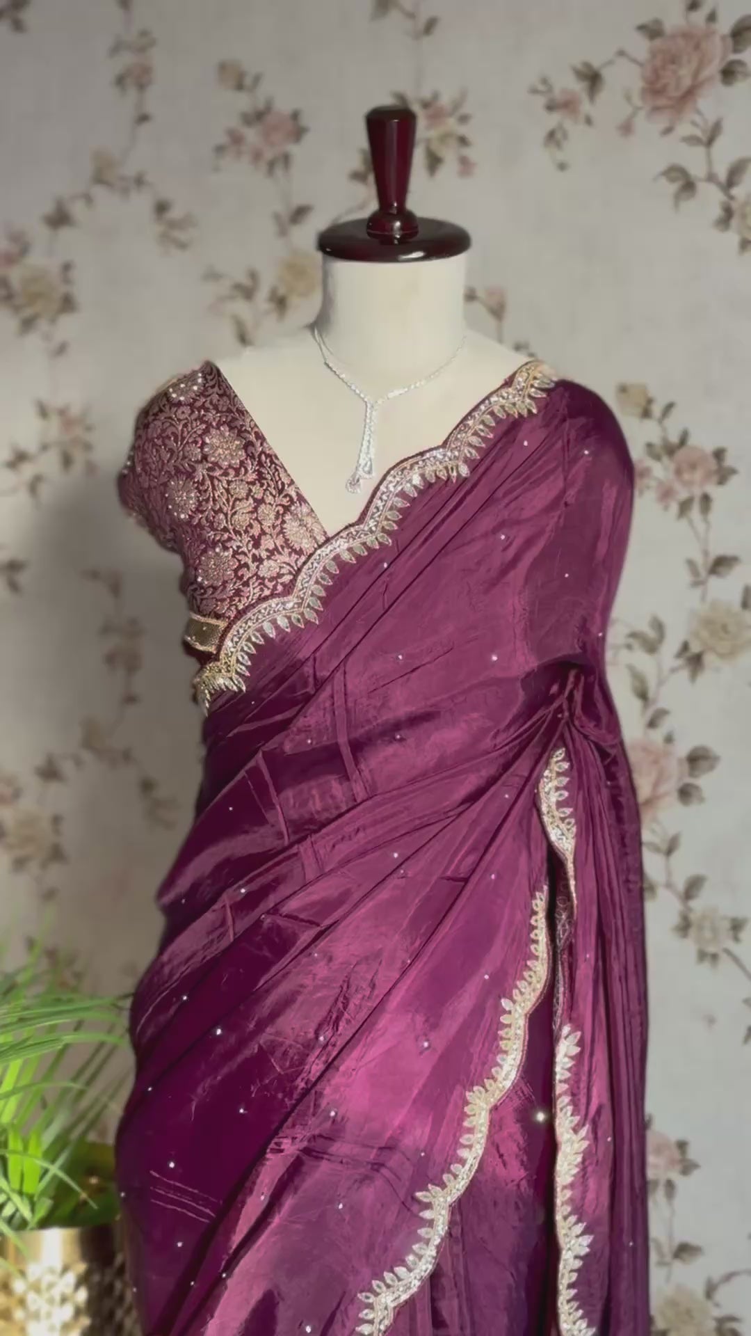 - A silk blend saree in a rich vine hue, featuring a mirror and tubelight embroidered border with playful tassels on the pallu, paired with a Banarasi blouse for a unique contemporary touch.