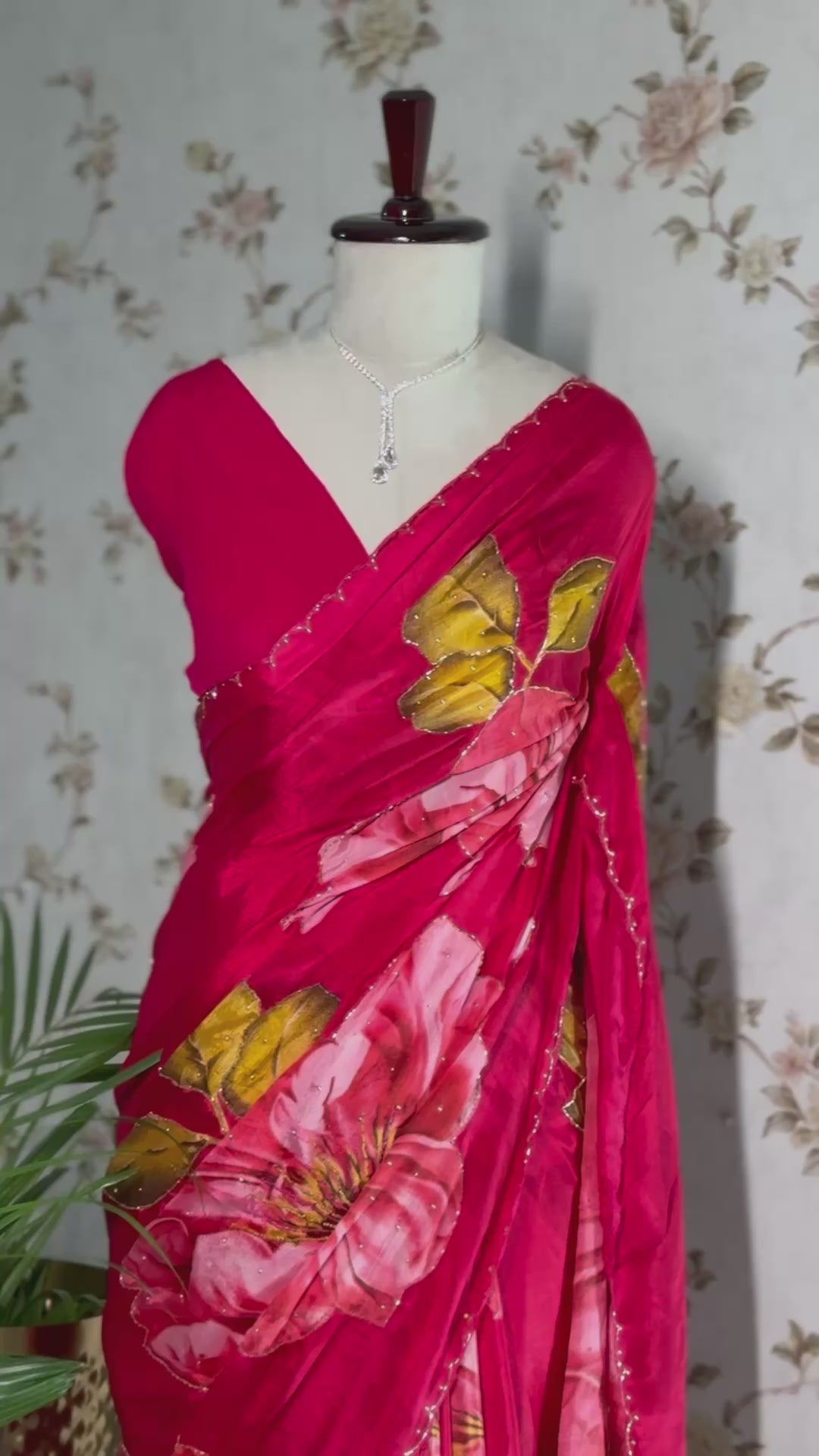 Drape yourself in elegance with this stunning chiffon red floral printed saree, featuring all-over tubelight and golden bead work that adds a subtle shimmer to every fold. The scalloped (scalped) border is delicately detailed, enhancing the saree’s graceful appeal. Perfect for festive occasions, parties, or weddings, this lightweight chiffon saree combines comfort with timeless glamour.