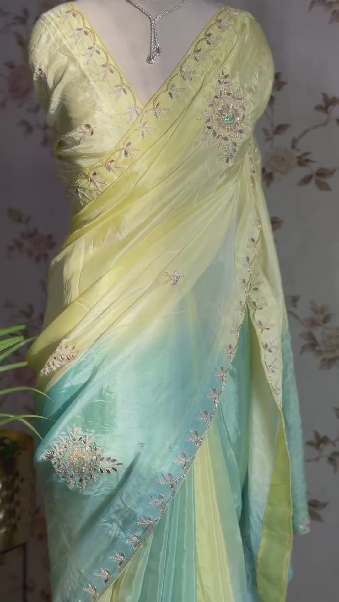 A graceful soft tissue silk saree in dreamy ombré tones of yellow and blue, adorned with a delicate zari, mirror, and pearl work border and boota — paired with a perfectly balanced blouse.