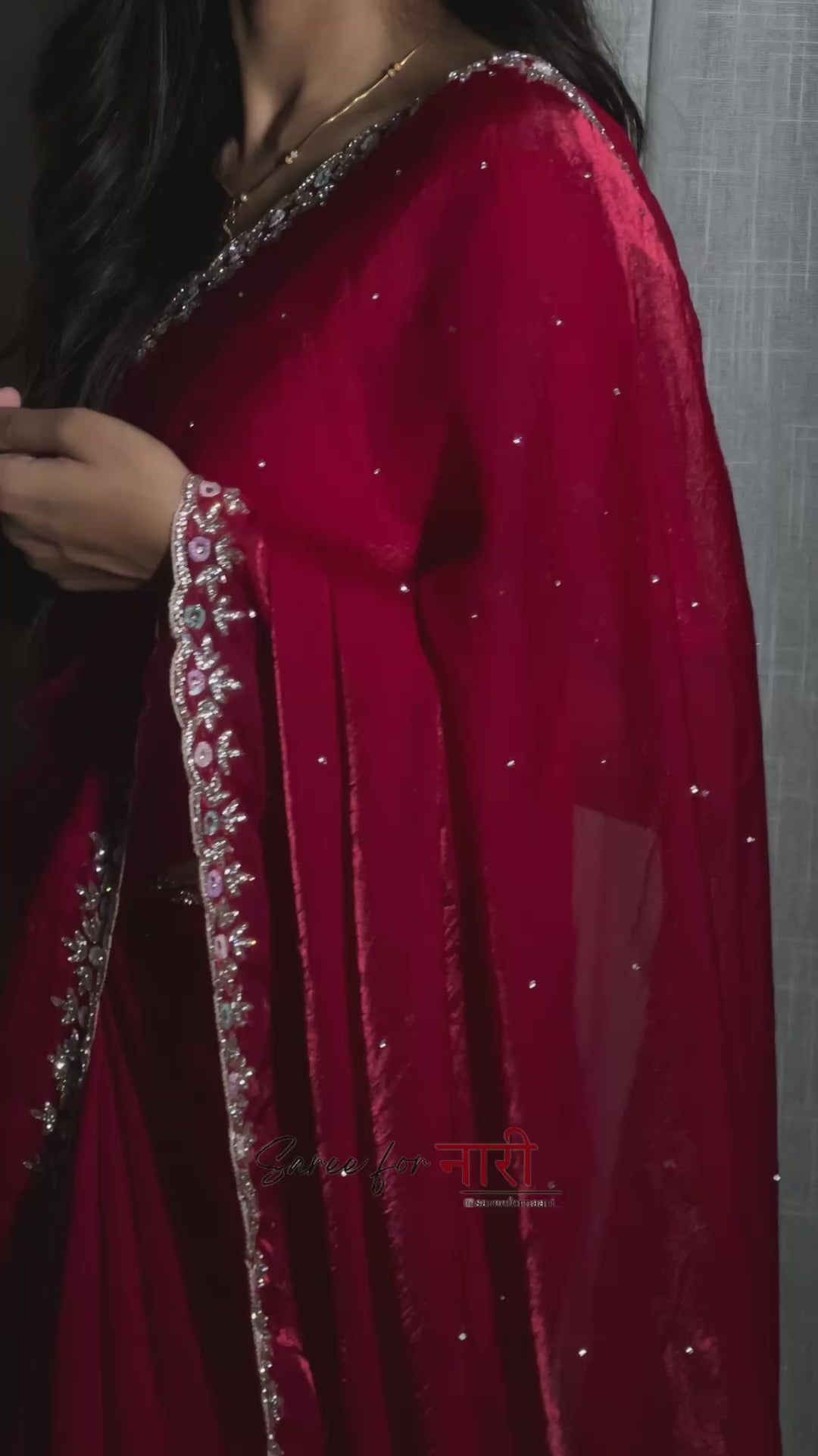 satin organza saree, delicately embellished with intricate handwork and mini stones all over. Paired with a heavy blouse and a statement jacket, making it a perfect ensemble for wedding events.